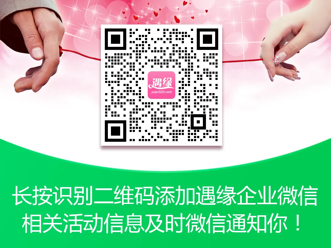报名方式:请微信扫码或长按识别二维码在线报名、付费,参加活动时请凭身份证准时签到参加。报名后请登录遇缘网(关注遇缘文化服务号)上传照片和实名认证,增加信用度,让异性放心与你联系和交往。