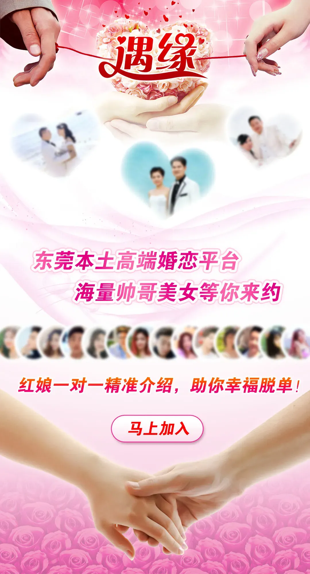 东莞心连心遇缘婚恋平台创始于2005年9月,是东莞地区成立较早、会员较多、服务较好、成功率高、收费实惠的正规婚介机构,所有正式会员都是经过严格的身份审核并签约单身保证书、会员服务协议,确保会员资料真实可靠,坚决杜绝“婚托”及“婚骗”现象。遇缘婚恋平台除了举办相亲活动,还有专业红娘根据你的条件和要求提供大数据精准匹配、高效一对一约会见面服务,针对性强,成功率高。