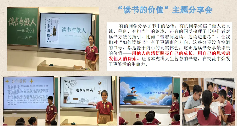九月“读好书 明价值”,师生共读肖复兴《读书与做人》,通过每日固定阅读、批注感悟、主题分享等形式,让学生在文字中体悟人生智慧,养成良好阅读习惯。