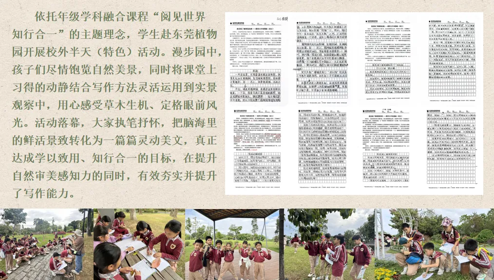 十月“赏美景 惜美情”,结合“自然之美”单元学习丁立梅散文《风会记得一朵花的香》,并依托“阅见世界 知行合一”课程开展东莞植物园校外实践,将静态描写、动态描写等写作技巧融入实景创作,让审美感知与表达能力同步提升。