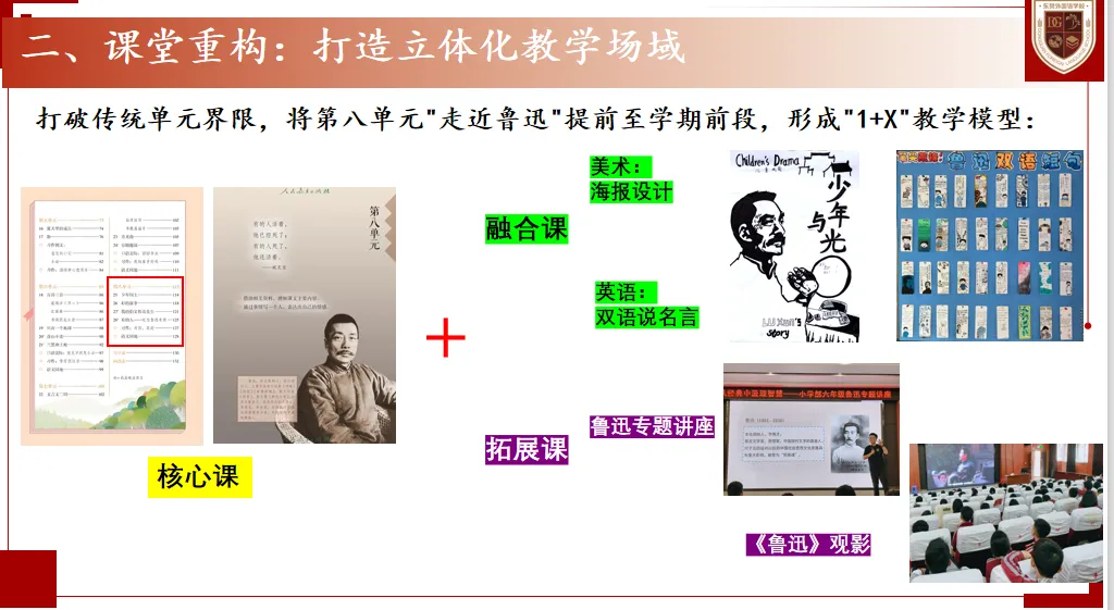 课堂上,创新打造“核心课 + 融合课 + 拓展课”的“1+X”教学模型:核心课深耕《少年闰土》《好的故事》等教材文本;融合课实现跨界联动,美术课设计鲁迅主题海报、英语课双语诵读名言;拓展课通过专题讲座、观影活动全方位呈现鲁迅精神内核。