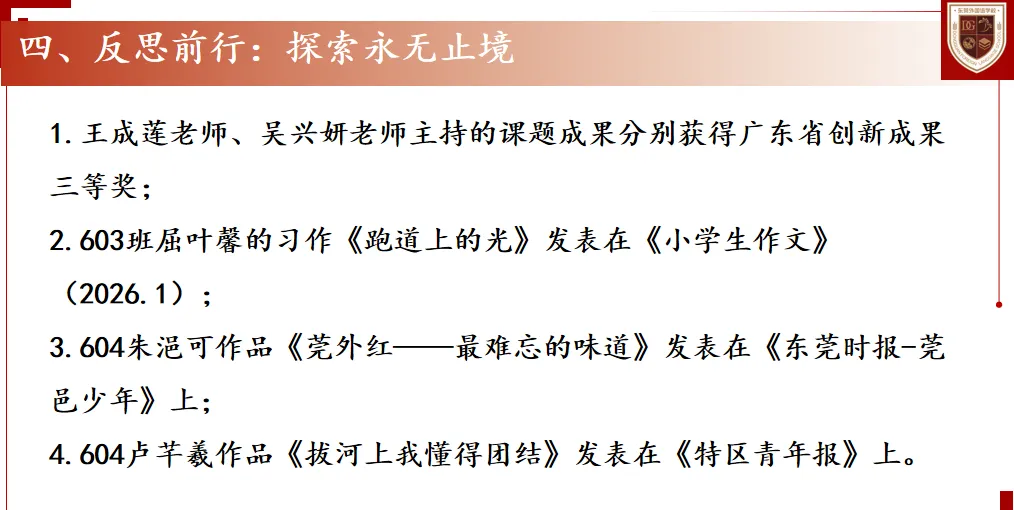 活动赋能环节,搭建多元化展示平台“舌尖上的校园美食”征文让学生以笔抒怀,艺术节《少年与光》朗诵演绎鲁迅家国情怀,家长会暨结课典礼全面展示学习成果。学期内,六年级学子硕果颇丰,屈叶馨《跑道上的光》、朱浥可《莞外红——最难忘的味道》等多篇习作发表于各类报刊,用文字书写成长风采,让经典浸润下的核心素养落地生根。