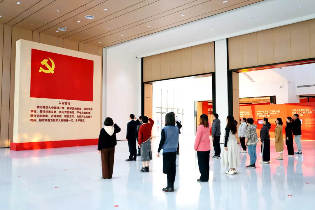 在参观学习结束后,全体党员同志面向党旗。在陈泽林书记的领誓下,全体党员庄严举起右拳,重温入党誓词。铿锵誓言回荡厅内,彰显着不忘初心、忠诚于党的坚定信念,与先辈们的革命精神遥相呼应。