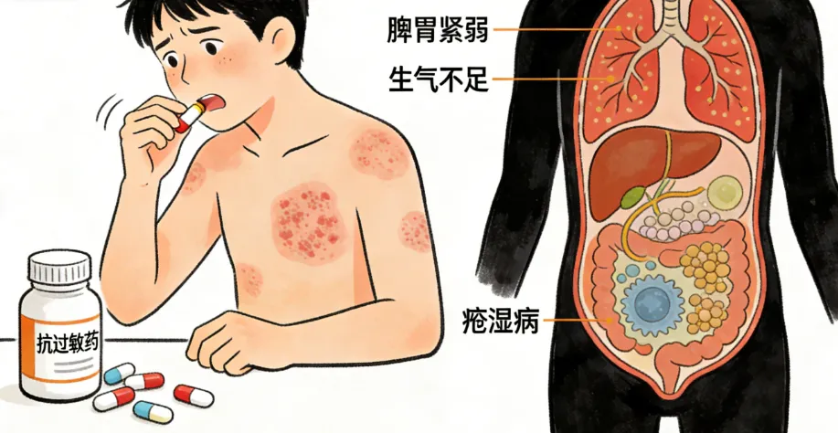 提到荨麻疹,很多人都有过这样的困扰:突然冒出一片风团,痒得抓心挠肝,吃点药就消退,可没过几天又卷土重来。有人归咎于过敏体质,有人反复排查过敏原,却忽略了一个核心根源——脾胃功能失调。