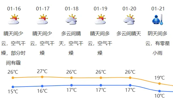 预计1月16日气温15℃-26℃。