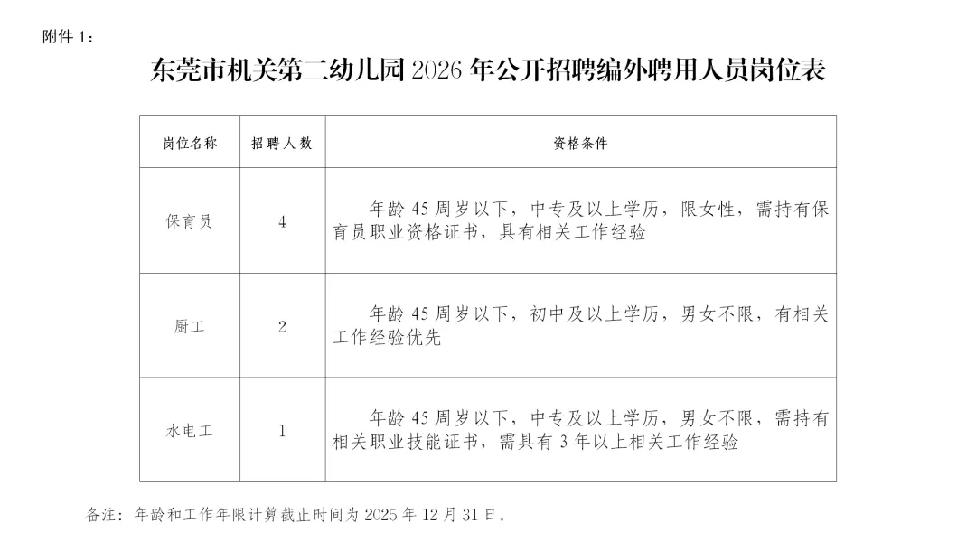 东莞市机关第二幼儿园是东莞市妇女联合会下属的市属公办全日制幼儿园,是广东省首批省一级示范幼儿园。因幼儿园发展需要,现公开招聘编外聘用人员7名。