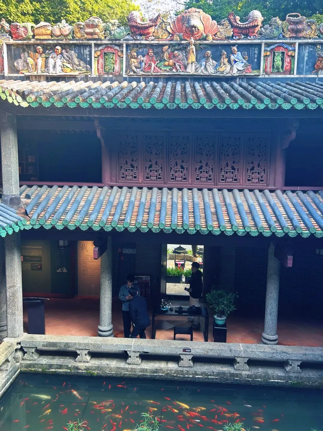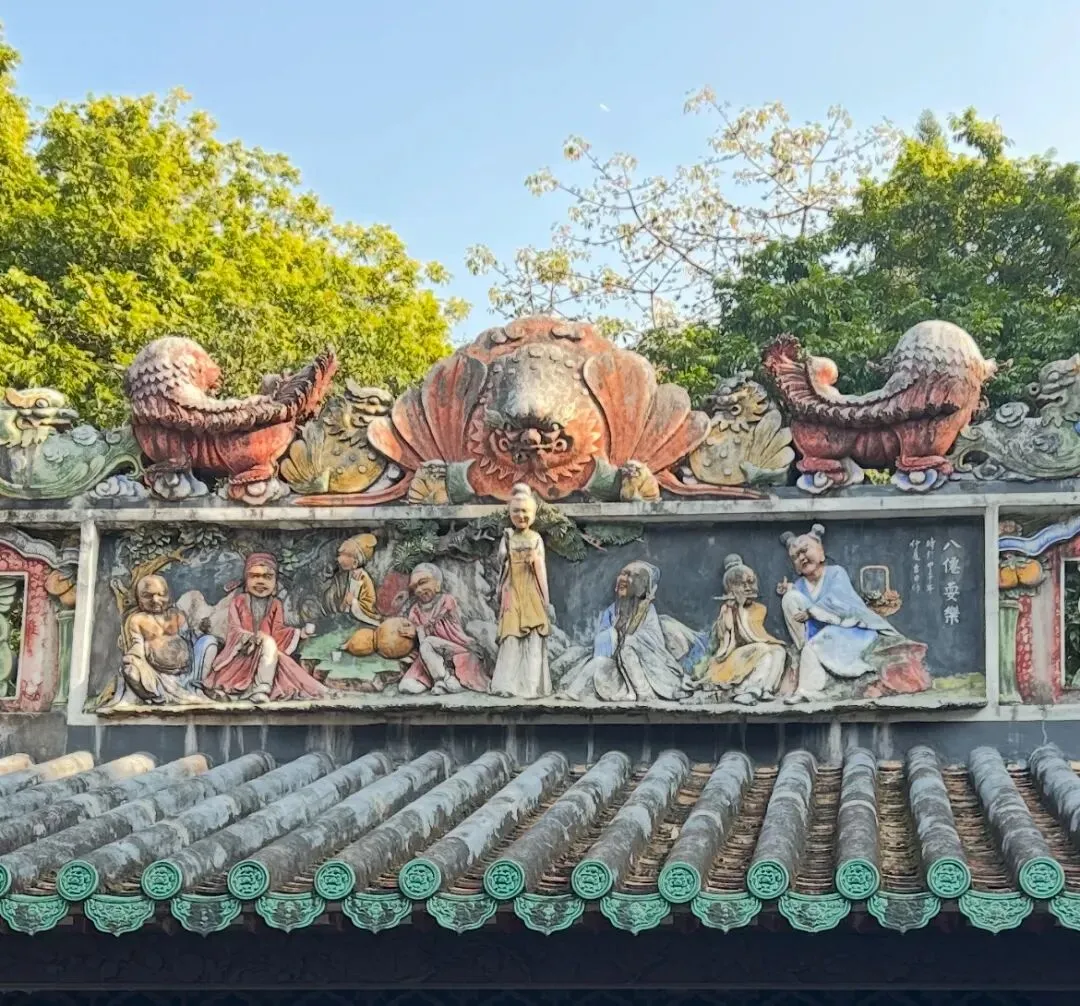 广州玉岩书院又称萝峰寺,从南宋始建算起至今已有900多年历史,院中历史遗迹不少,但举世罕见的人文和自然景观大家不一定都知道。我暂且简单介绍下,以便下次来这里的朋友可以有目的地探寻、观赏。玉喦堂是萝峰寺的中心主建筑,从山脚沿阶梯一路攀登,到达挂有玉岩书院牌匾的大堂时,一座三层的楼宇矗立眼前。楼台采用中间天井式的中式传统建筑,天井正中是一池鱼塘,锦鲤游弋,走廊贯通每层大殿和侧房。通风采光效果极佳,非常适合岭南的气候和生活方式。当你走上最高层廊亭,观望远方萝峰山脉的绿野时,就会发现眼前屋顶上的彩色雕塑不同一般。果然,栩栩如生的人物造型在山巅与蓝天之间活灵活现,仔细观察就能一眼认出每位过海八仙。因为每层楼的廊厅不是完全开放,因此无法看到有些角度的雕塑。不过仅仅有限的一两个方位,就足以让前来探访的游客大饱眼福。