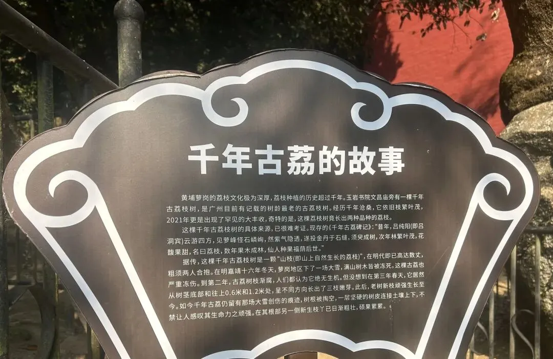像这两棵树龄超长且生长极为高大的树木在玉岩书院的山间林下比比皆是,最为奇特的是山上文昌庙旁的一株千年荔枝古树,据记载这是广州市目前发现的最古老荔枝树。