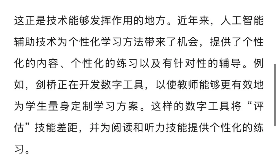 This is where technology can help. In recent years, AI-assisted technologies have opened opportunities for personalised learning approaches, with tailored content, individualised practice and targeted tutoring. Cambridge, for example, are creating digital tools to enable teachers to personalise their students’ learning more effectively. Such digital tools will ‘assess’ skill gaps and offer personalised practice for reading and listening skills.