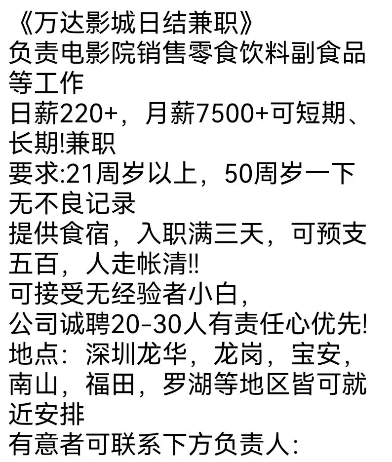 【深圳招聘】影城日结兼职220/天,7500+/月
