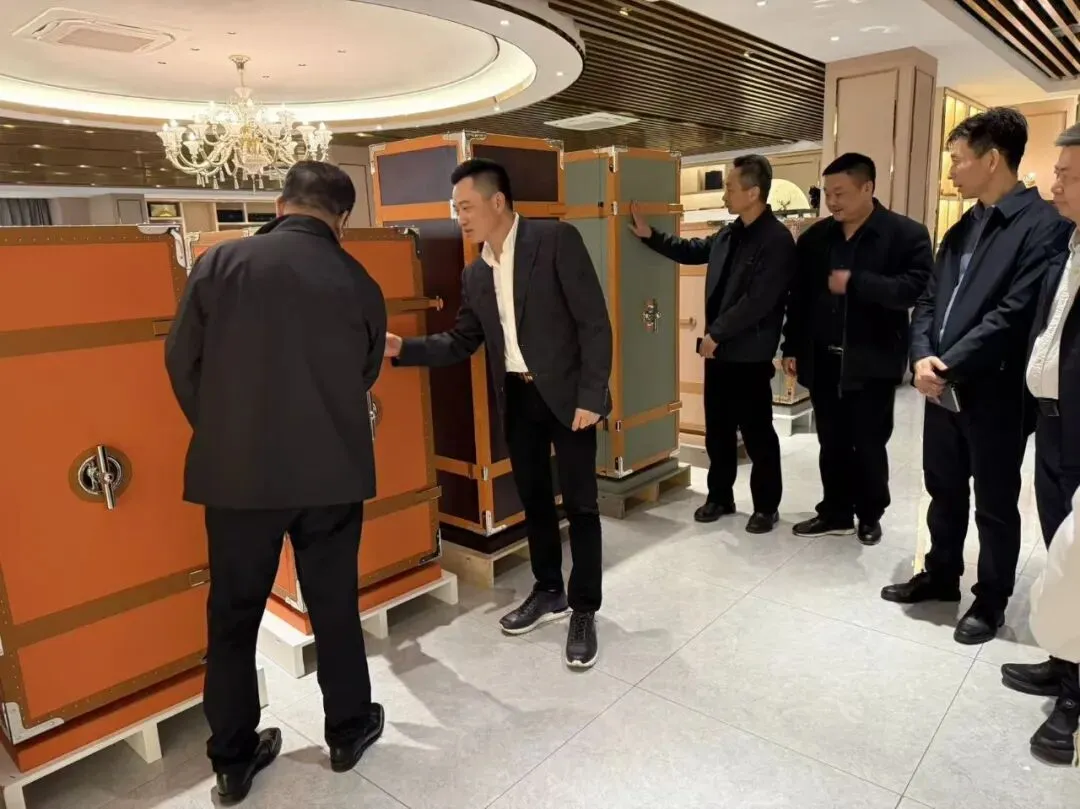 调研组深入产品展厅,实地考察了瑞丰源的核心产品与制造工艺。王董重点介绍集团的特色产品矩阵:瑞丰源各类高端定制品牌包装、集团法国品牌YORK WANG融合顶级安全技术与美学设计的高端保险箱/柜系列、集精准环境控制与收藏艺术于一身的高端雪茄盒/雪茄柜系列,以及精致考究、尽显工艺魅力的高端首饰盒系列。