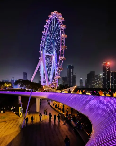 欢乐港湾的“湾区之光”摩天轮是地标,傍晚坐一圈,看海上的日落和城市的灯一起亮起,浪漫值拉满。