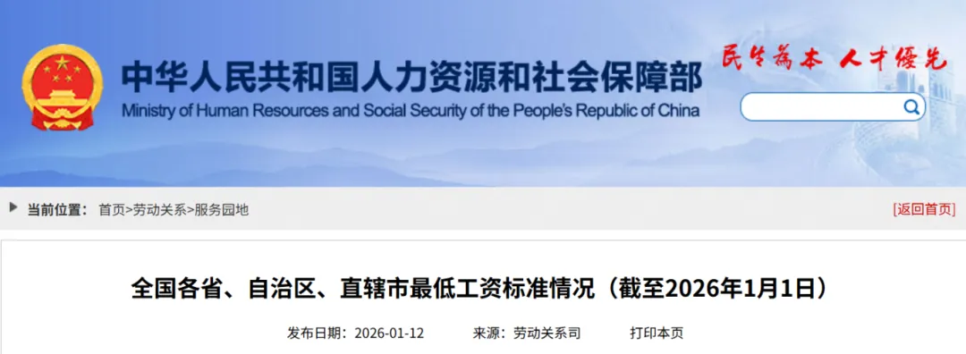 2026年最低工资标准情况。图源:人力资源和社会保障部