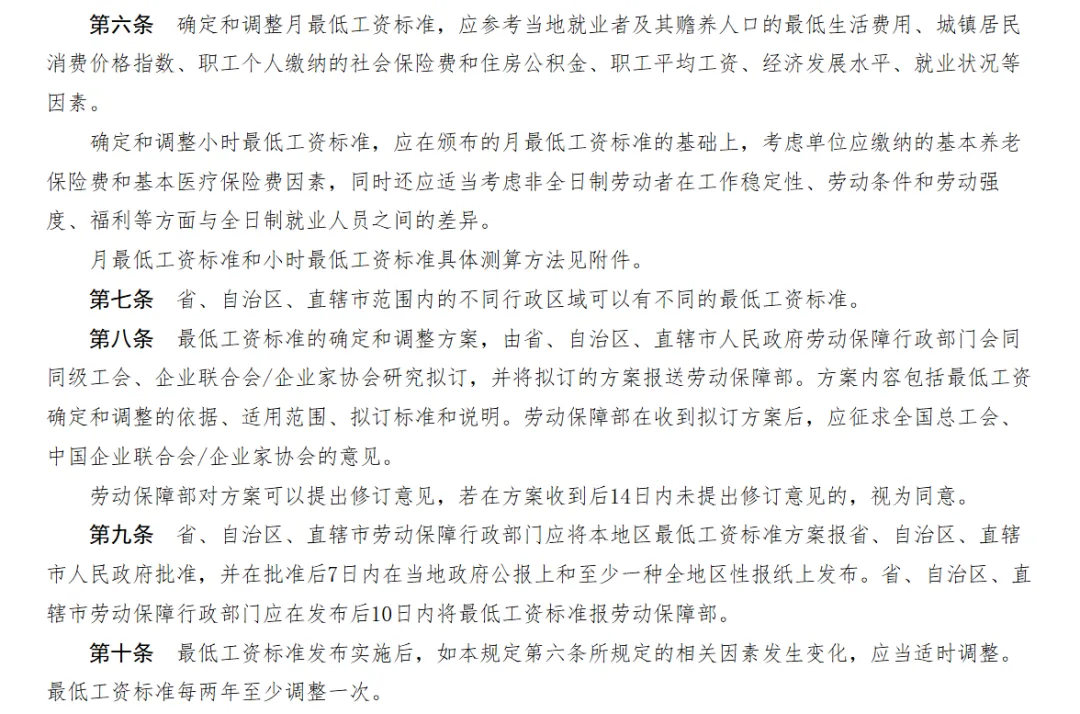 确定和调整月最低工资标准,主要参考本地区就业者及其赡养人口的最低生活费用、城镇居民消费价格指数、职工个人缴纳的社会保险费和住房公积金、职工平均工资、经济发展水平、就业状况等因素。