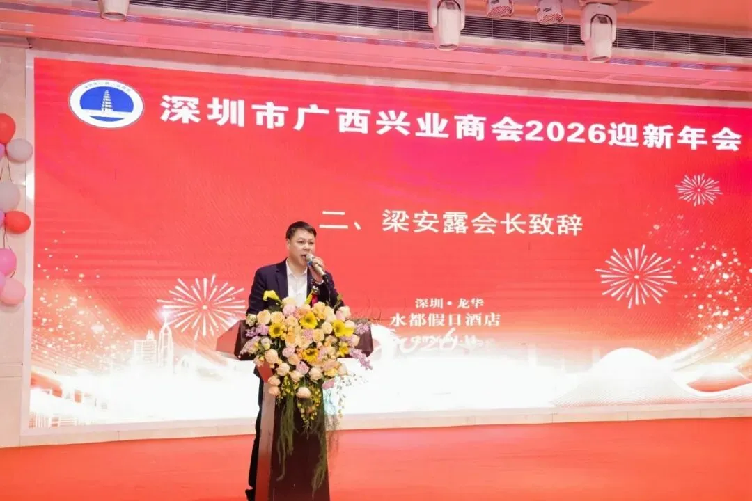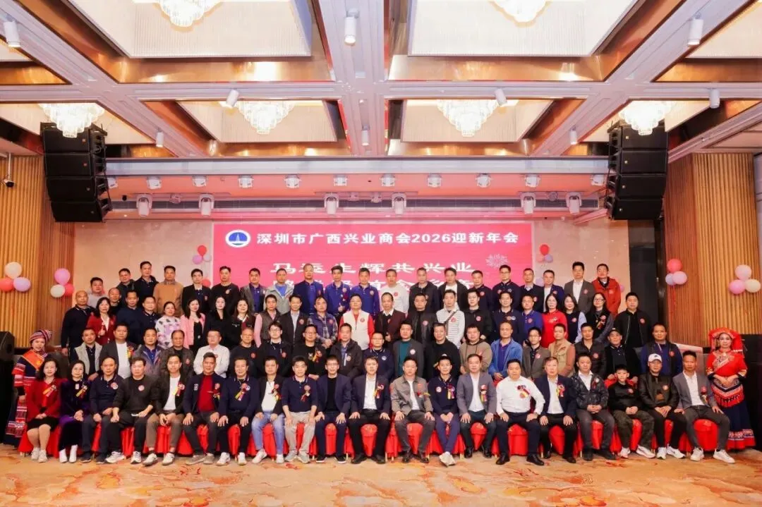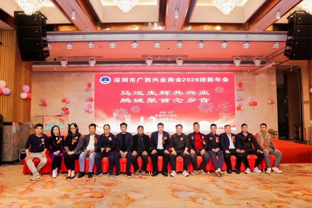 马运生辉共兴业,聚首鹏城念乡音。2026年元月11日晚上七点,深圳龙华新区,按五星级标准建筑装修的水都假日酒店二楼宴会厅,在庄严雄壮中华人民共和国国歌声中,200多位深圳市广西兴业商会会员和会员邀请的个人嘉宾,共同见证了商会一年一度的高光时刻——2026年迎新年会正式拉开了帷幕。今年的年会,不外请其它团体和单位,主要是会员内部自娱自乐为主,不搞铺张浪费的排场,为的就是让全体会员老乡在轻松愉悦的氛围中度过一个难忘的迎新之夜。