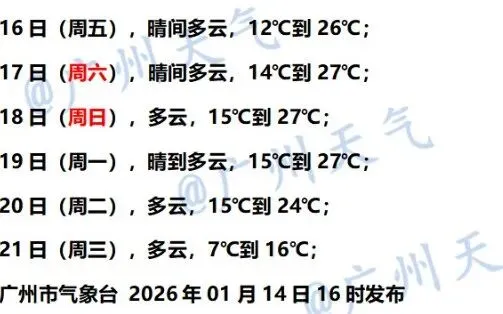 1月16日,肇庆、清远、韶关和南部沿海市县多云间阴天,其余大部市县晴天间多云。西江流域、珠三角南部沿海和雷州半岛早晚有(轻)雾。最低气温:粤北市县9~11℃,珠三角南部沿海市县和雷州半岛15~18℃,其余市县12~14℃。