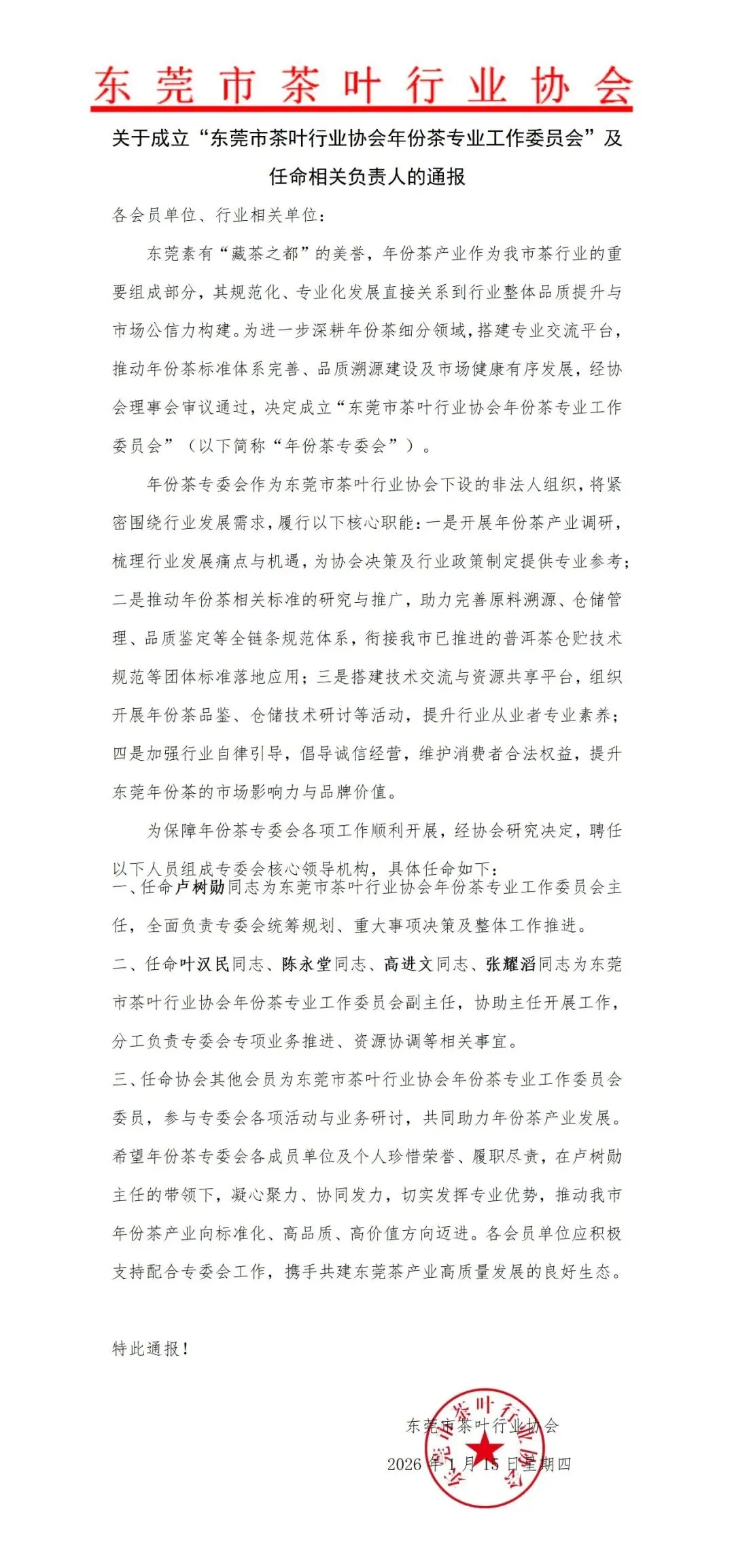 2026年1月15日,东莞市茶叶行业协会第四届理事会第六次会议在昌兴存茶举行,会议决定成立“东莞市茶叶行业协会年份茶专业工作委员会”并任命卢树勋为专委会主任、陈永堂、叶汉民、高进文、张耀滔为副主任。全体理事齐聚一堂,总结工作、部署规划,为东莞茶产业高质量发展锚定方向。