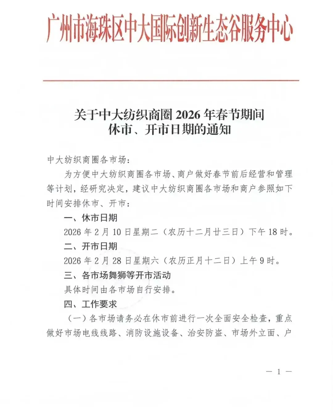 关于中大纺织商圈2026年春节期间
