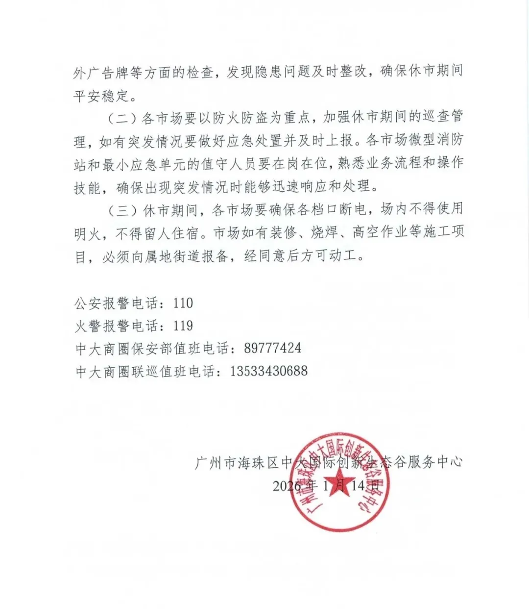 (三)休市期间,各市场要确保各档口断电,场内不得使用明火,不得留人住宿。市场如有装修,烧焊,高空作业等施工项目,必须向属地街道报备,经同意后方可动工。