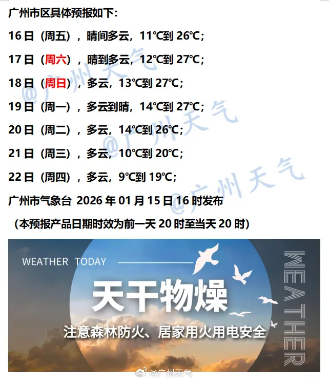 广州市气象台预计,未来三天广州晴间多云,气温继续回升,最高温可冲上27℃。不过,昼夜温差大,早晚还是有点寒凉。1月20日起,受新一股冷空气影响,广州气温将再次下降。
