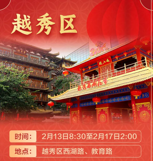 越秀区 | 西湖路、教育路 | 2月13日8:30-2月17日(正月初一)凌晨2时 | 国家级非遗,老牌情怀花街,设桃花街、广府非遗市集、水上花船 |