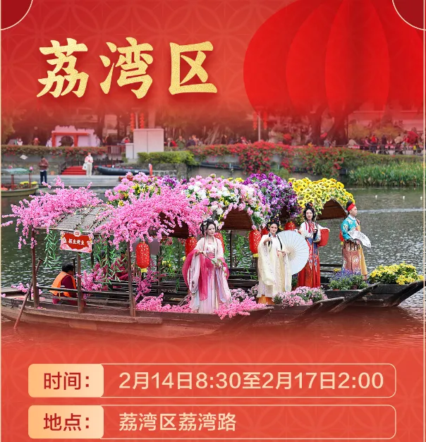 荔湾区 | 荔湾路(传统花市)、荔枝湾景区(水上花市) | 传统花市:2月14日-16日(除夕)8:30-24时(除夕延至凌晨2时);水上花市:1月22日-24日 | 西关韵味十足,水陆皆繁花,联动西关美食区,可乘船赏花 |
