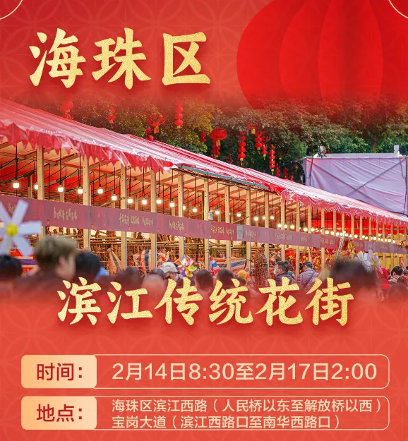 海珠区 | 滨江西路、宝岗大道段(滨江花市);江南西路碧水瑶溪牌坊沿岸(水岸花市) | 滨江花市:2月14日8:30-2月17日凌晨2时;水岸花市:2月6日-14日 | 广州唯一临江花市,江风伴花香;水岸花市融合电竞、潮流集市 |