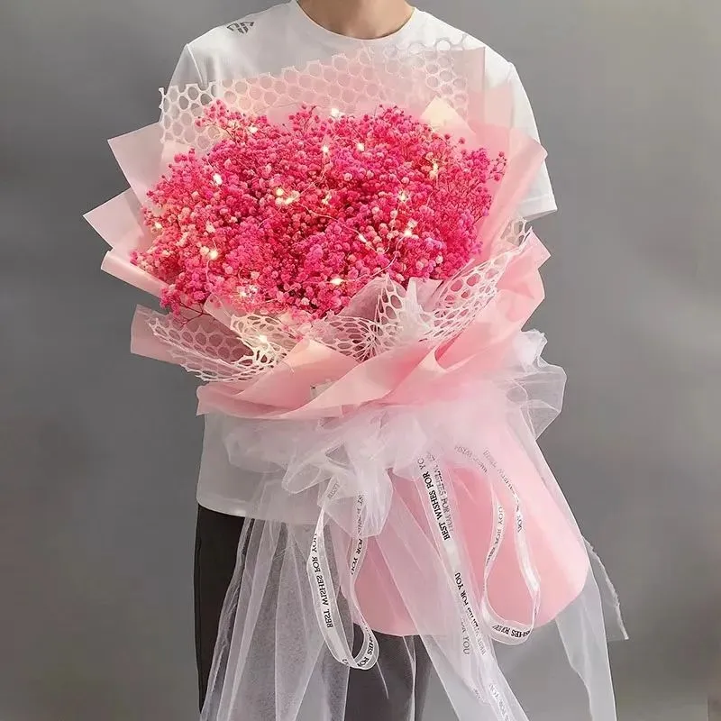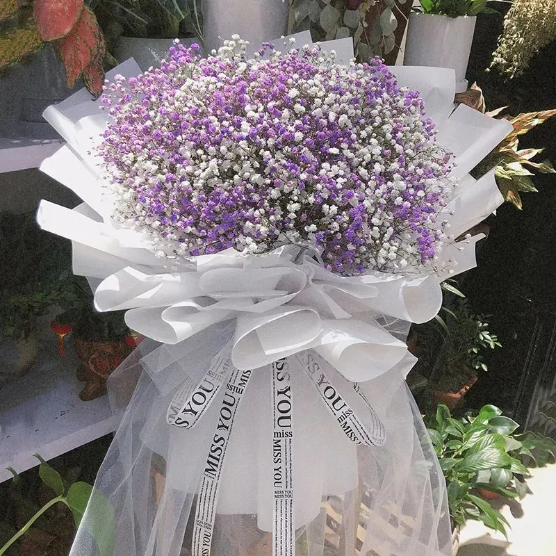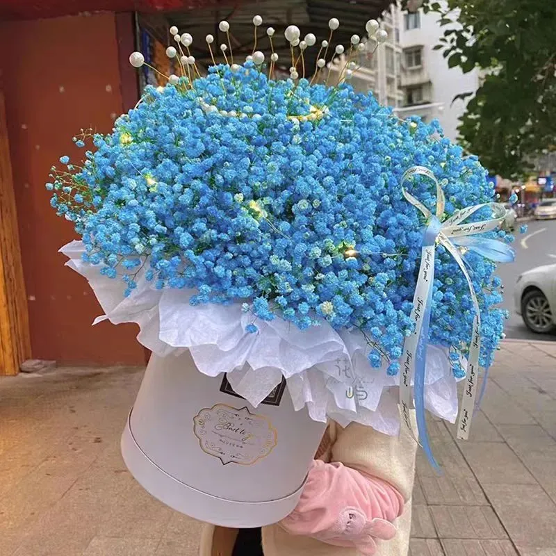 除了玫瑰和百合,满天星也是备受青睐的花材。满天星小巧玲珑,星星点点的花朵如同夜空中的繁星,给人一种梦幻、浪漫的感觉。它可以作为主花材,打造出清新淡雅的花束;也可以作为配花,与其他花卉搭配,增添一份灵动与俏皮。用满天星制作的花盒,更是别具一格,当TA打开花盒的那一刻,仿佛置身于一片浪漫的星空之下。