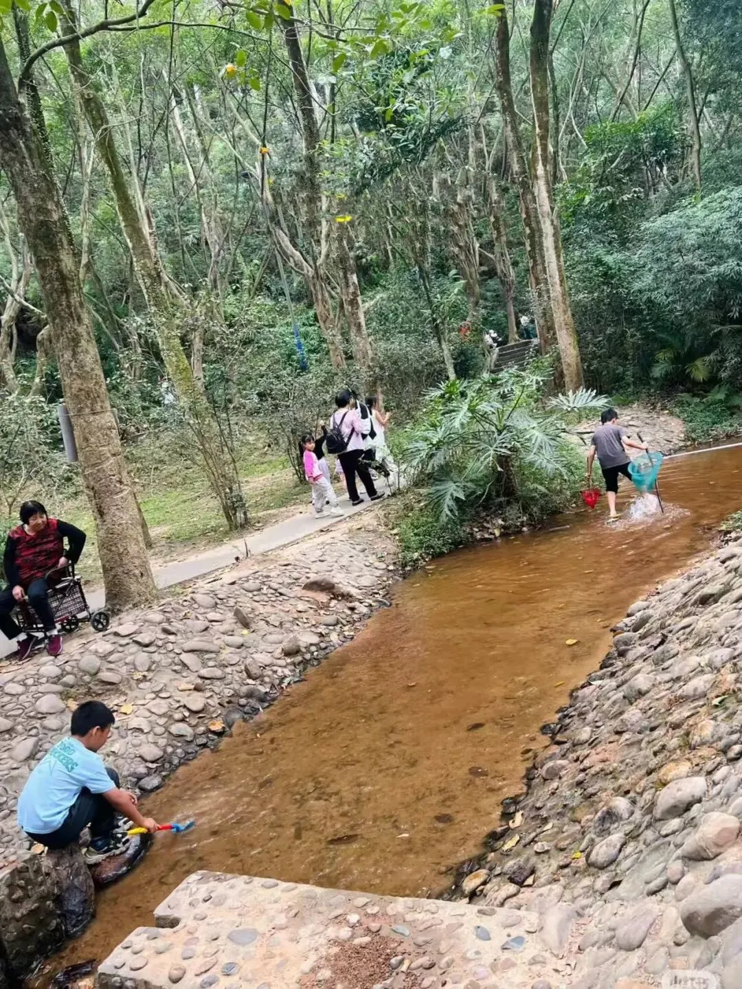 顺着公园绿道向前走,总在不经意间遇见溪流。浅浅的溪水被阳光晒得温润,很多家长带着小孩在溪水里摸鱼抓虾,偶尔惊起小小的水花与低低的欢呼。笑闹声沿着溪水漾开,仿佛连时光都变得透明而柔软。