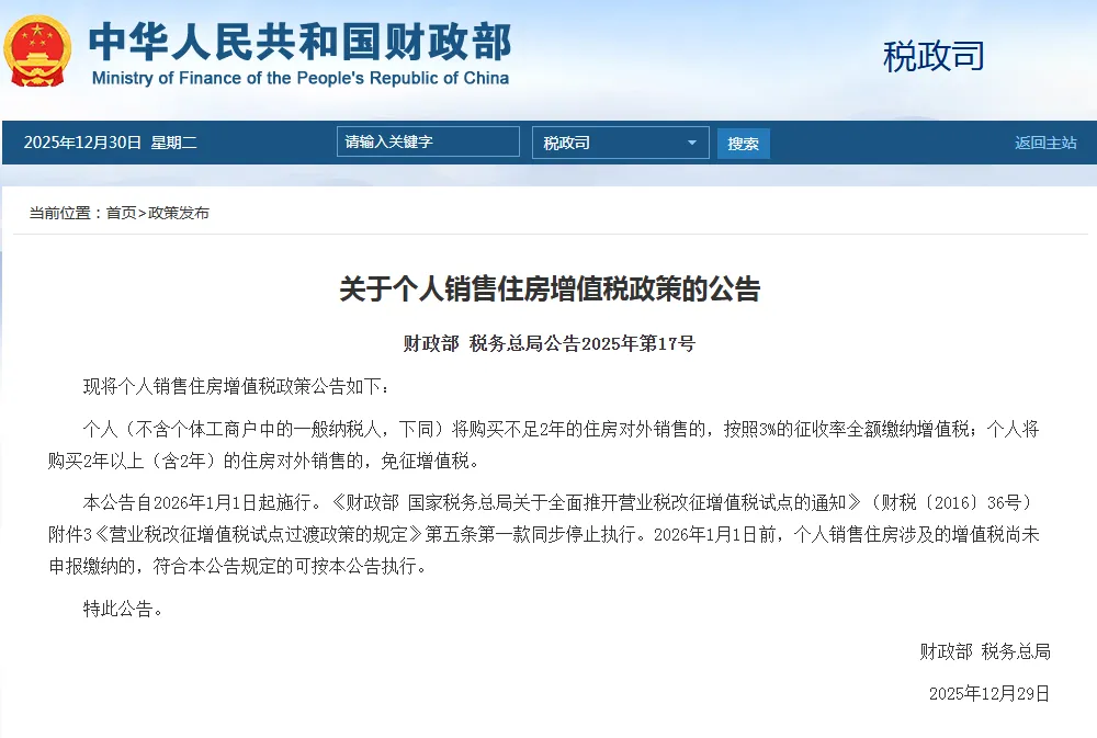 本公告自2026年1月1日起施行。《财政部 国家税务总局关于全面推开营业税改征增值税试点的通知》(财税〔2016〕36号)附件3《营业税改征增值税试点过渡政策的规定》第五条第一款同步停止执行。2026年1月1日前,个人销售住房涉及的增值税尚未申报缴纳的,符合本公告规定的可按本公告执行。