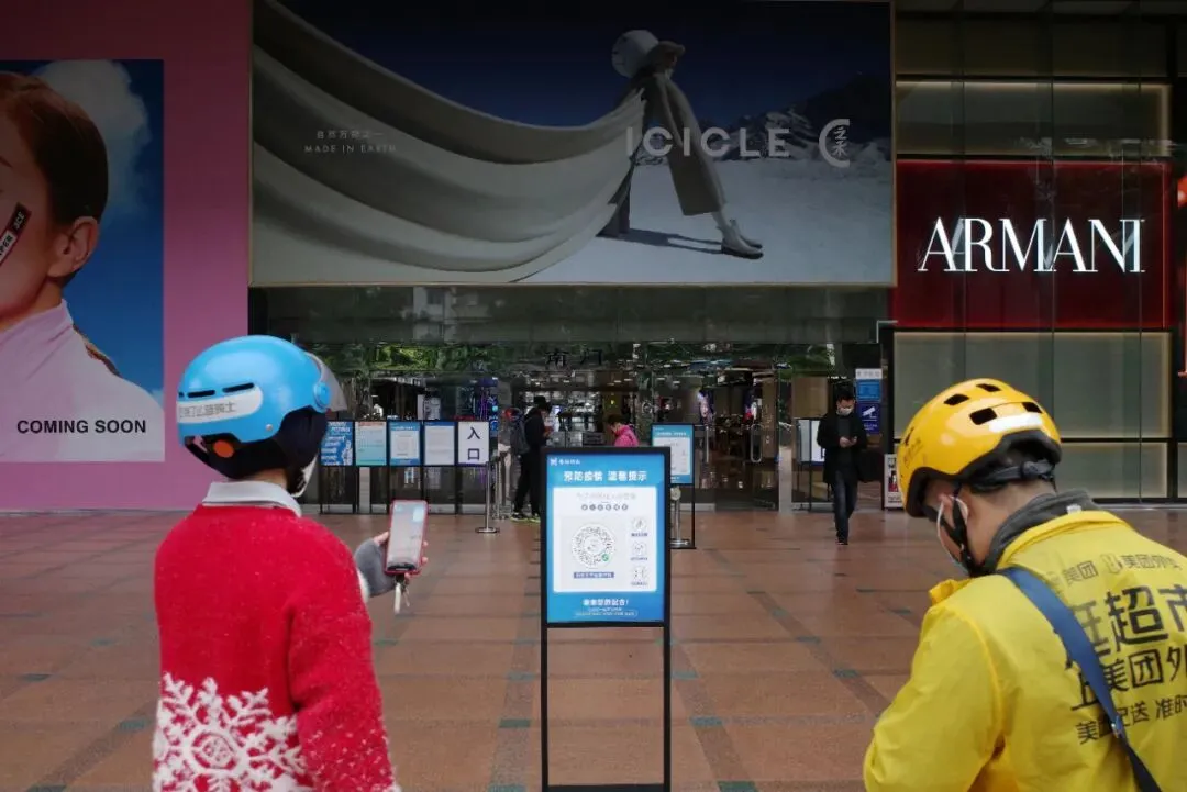 12月1日,广州市天河区,外卖小哥扫码进入天河城商场。广州天河多个商超发布通知,进出需扫场所码,出示健康码绿码,部分商场不再查验48小时核酸检测阴性证明。 中新社记者 陈楚红 摄