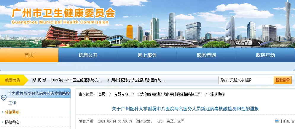 14日,广州市卫健委发布“关于广州医科大学附属市八医院两名医务人员新冠病毒核酸检测阳性的通报”。