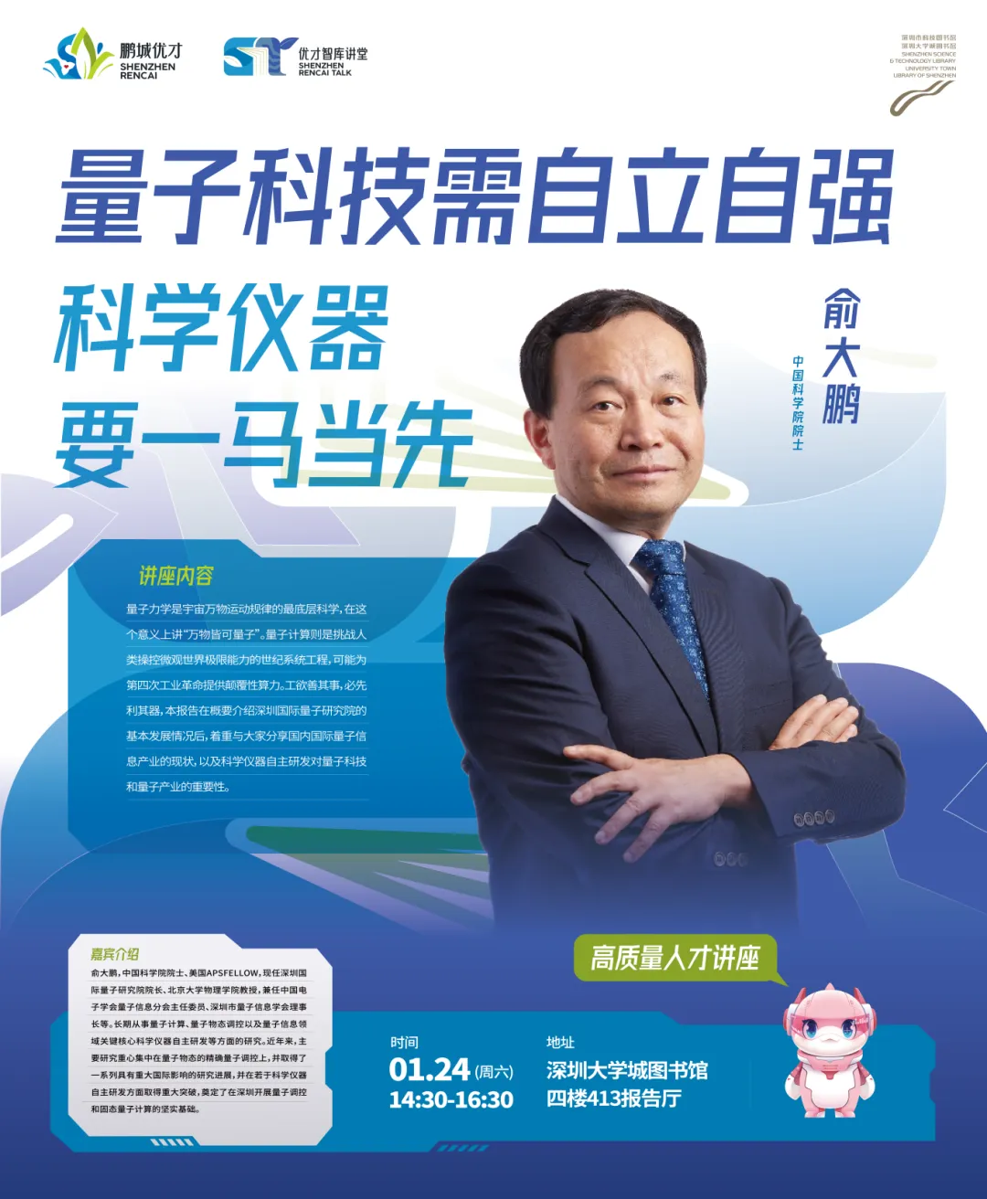 深圳市“鹏城优才卡”持卡人俞大鹏,中国科学院院士、美国APS Fellow,现任深圳国际量子研究院院长、北京大学物理学院教授。兼任中国电子学会量子信息分会主任委员、深圳市量子信息学会理事长等。长期从事量子计算、量子物态调控以及量子信息领域关键核心科学仪器自主研发等方面的研究。近年来,主要研究重心集中在量子物态的精确量子调控上,并取得了一系列具有重大国际影响的研究进展,并在若干科学仪器自主研发方面取得重大突破,奠定了在深圳开展量子调控和固态量子计算的坚实基础。