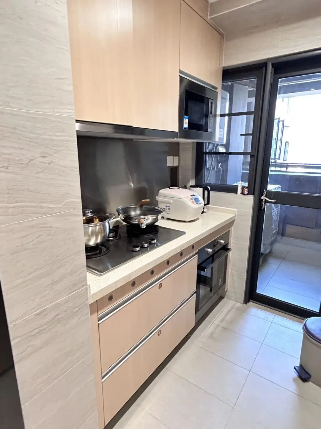 💁🏻♀️キッチンは収納スペースが豊富で、床と作業台は白色タイル貼りで、清潔感にあふれています。最大の特徴は、ガスコンロを使用できること。さらにオーブンや電子レンジなども完備されており、様々な料理作りに大変便利です。また、すぐ横には小さなバルコニーがあり、キッチン内はさらに明るく開放的な印象です。