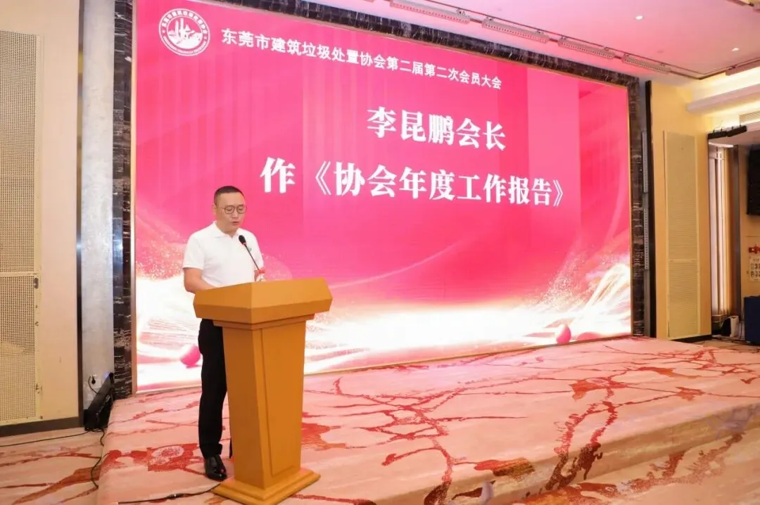 东莞市建筑垃圾处置协会会长李昆鹏首先向大会作了《协会2025年度工作报告》,全面回顾了协会在组织革新、安全生产、党建引领、技能提升、政策宣讲、资源化利用及热心公益等方面取得的显著成绩。他指出,2025年是协会发展历程中不平凡的一年,协会通过一系列举措,有效推动了东莞市建筑垃圾处置行业的规范化、绿色化发展。