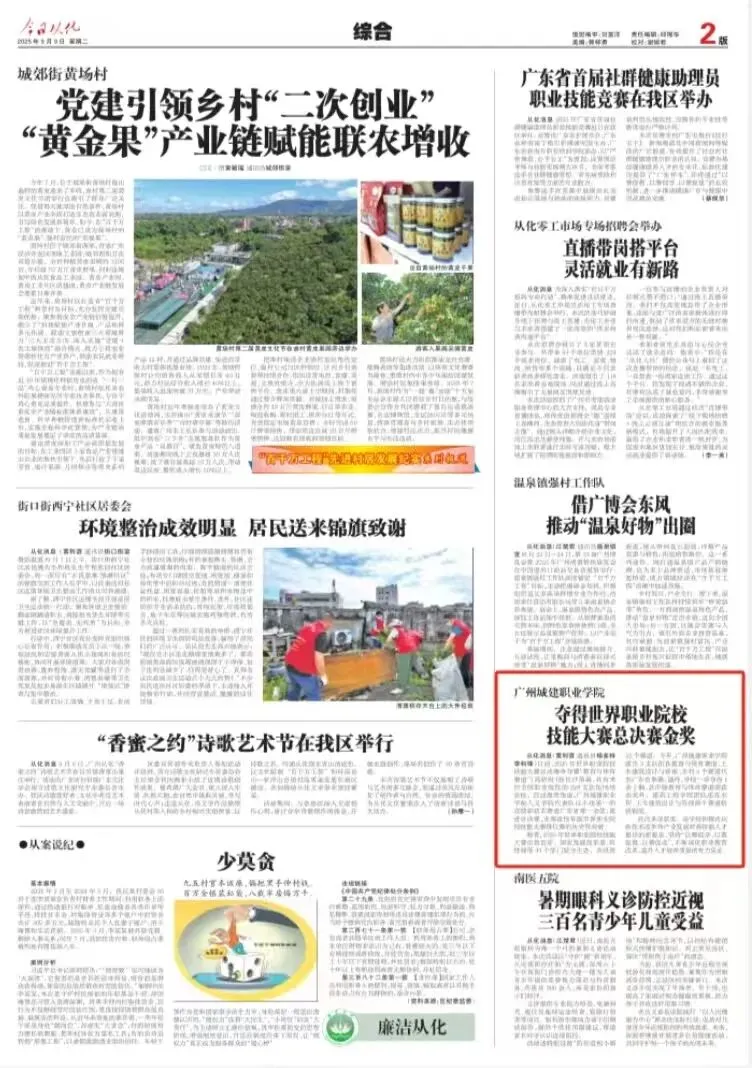从化消息(黄利谊 通讯员杨多特李科锋)日前,2025 年世界职业院校技能大赛总决赛争夺赛“教育与体育赛道”高职组)在长沙落幕,共有来自全国职业院校的 228 支队伍同场竞技。经过激烈角逐,广州城建职业学院人文学院代表队以小组第一的成绩斩获本赛道广东省唯一金奖,挺进总决赛,实现该校晋级世界职业院校技能大赛排位赛的历史性突破。