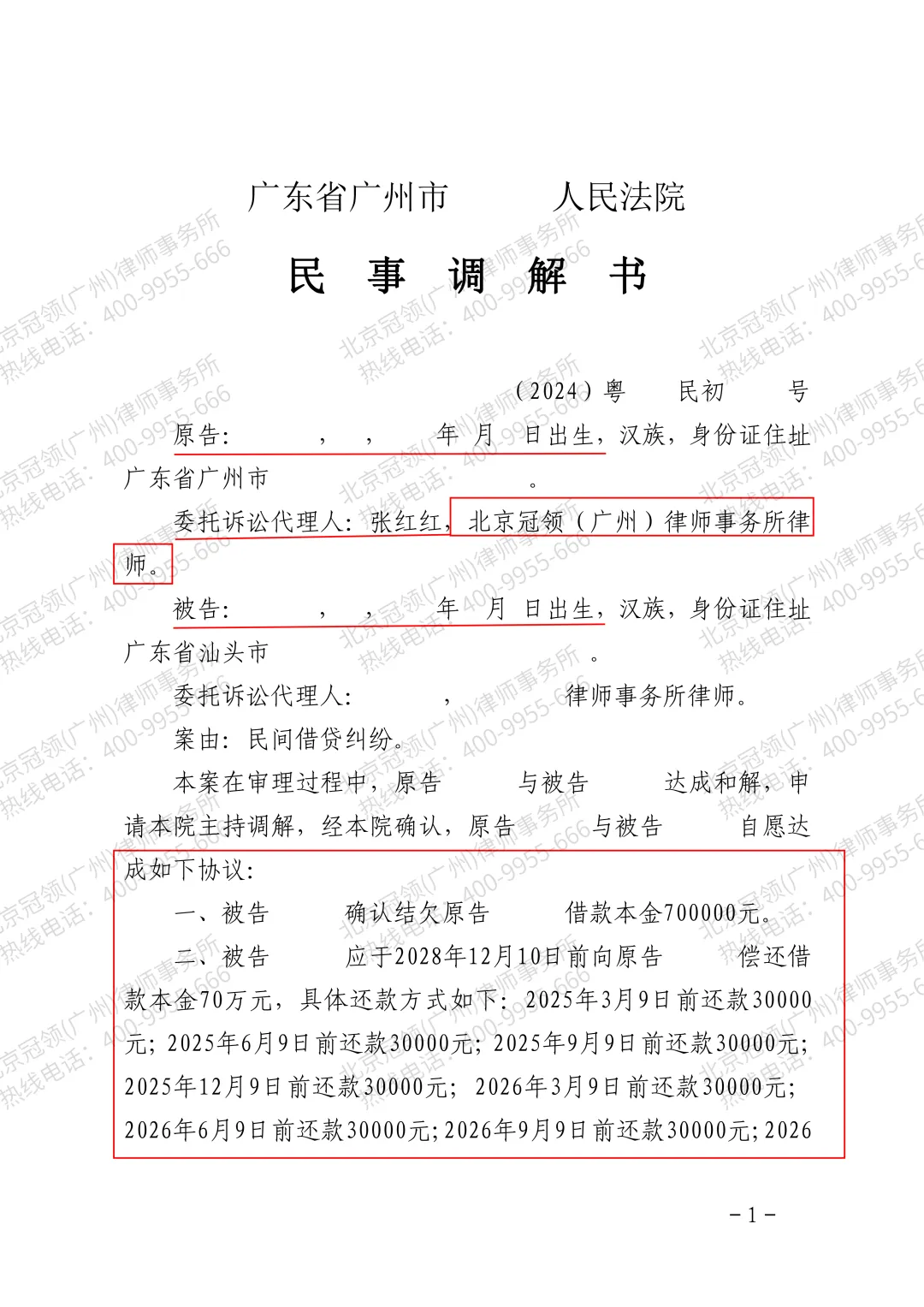 2015年年初,广州的王女士借给外甥高某70万用于买房。之后,高某仅仅返还了利息,本金迟迟未还。为要回借款,王女士委托北京冠领(广州)律师事务所律师代理起诉。近日,在冠领律师的专业代理下,经过法庭调解,王女士与高某达成分期还款协议,为这笔长达十年的借贷关系划上了句号。