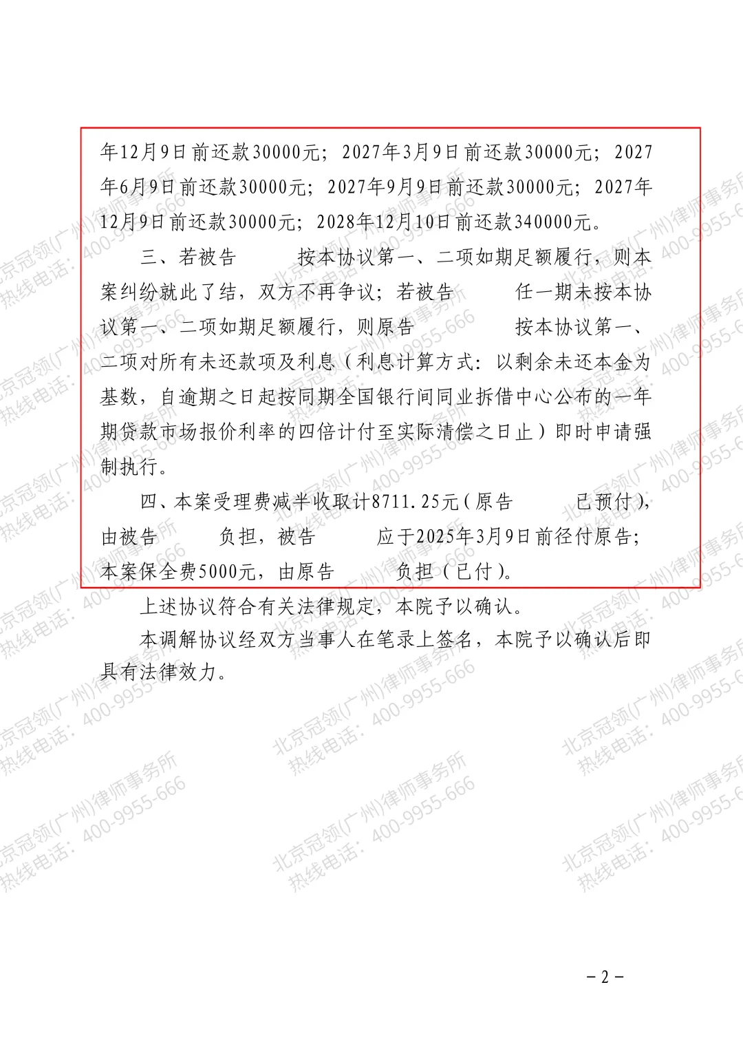 最终,法院经审理作出调解书:高某确认结欠王女士借款本金70万,并承诺按照冠领律师提出的偿还方式还款,双方纠纷得以化解。