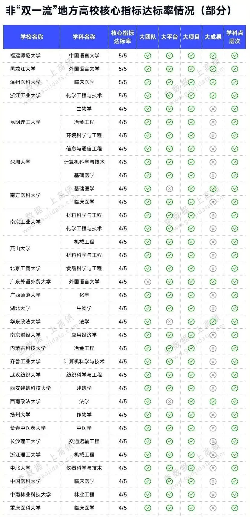 据统计,深圳大学的信息与通信工程、计算机科学与技术、基础医学3个学科;南方医科大学的基础医学与临床医学;广东外语外贸大学的外国语言文学学科核心指标达标率均已在4/5及以上,处于预备“双一流”的第一梯队!