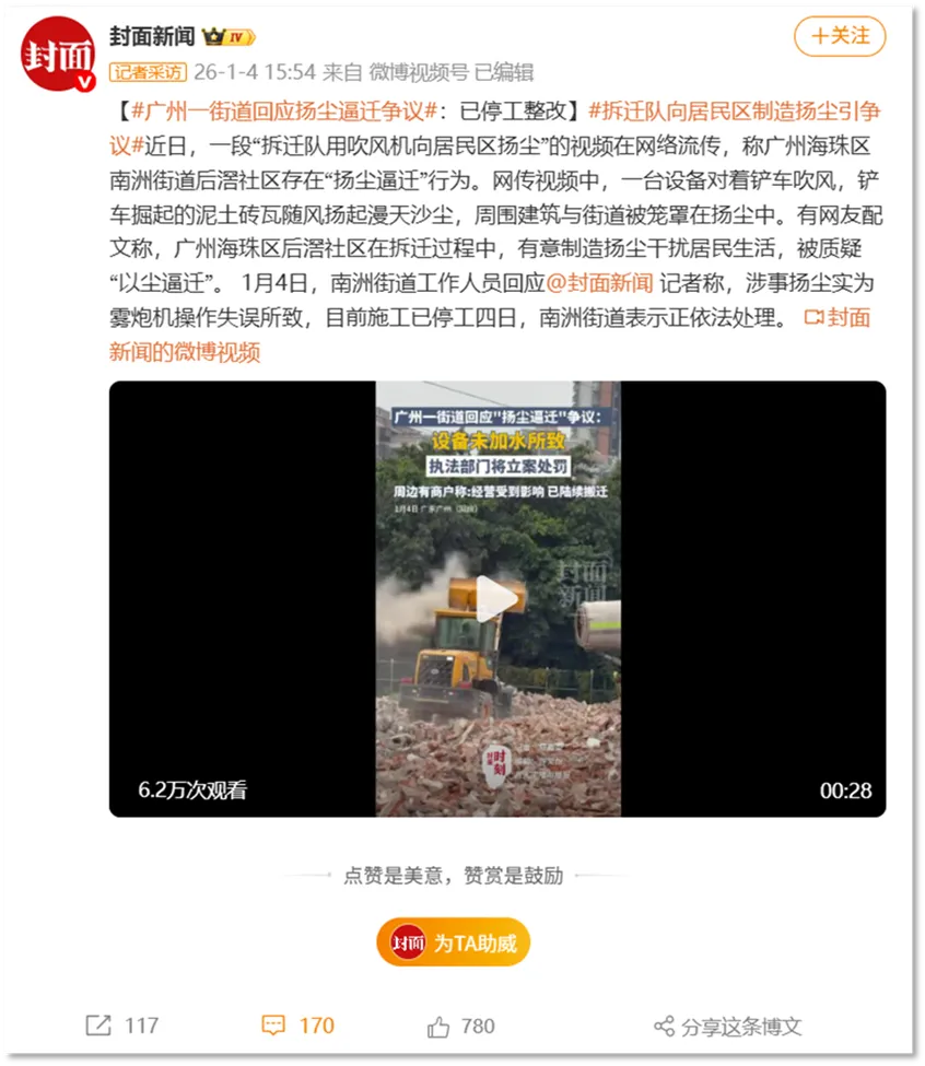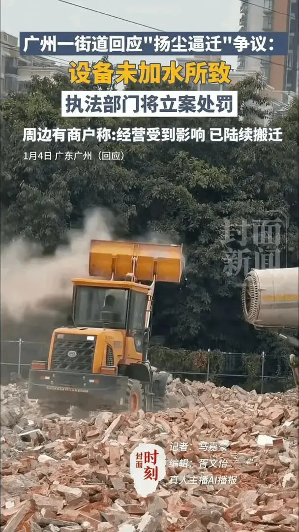 2026年1月4日,更多新闻媒体介入报道此事。南洲街道在回应《四川日报》旗下封面新闻记者时,称系“洒水车未加水”的操作失误。该回应被质疑是搪塞敷衍,“扬尘逼迁”成为该起事件的一个标签,社会关注度和能见度因此骤然飙升。海珠区南洲街道的回应,如同火上浇油,反而激发更大范围的扩散和关注,助推该舆情事件迅速扩展成了全国性的围观事件。
