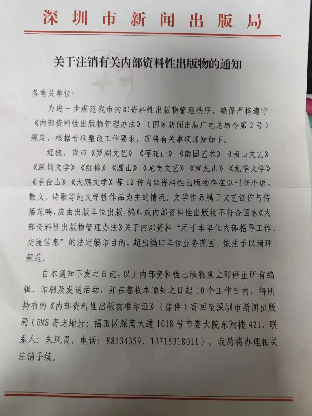 重要通知:深圳市有关部门要求从2026年起,《罗湖文艺》《莲花山》《深圳文学》《南国艺术》《南山文艺》《龙岗文艺》《龙华文学》《大鹏文学》《羊台山》《红棉》《园山》等12个内部资料全部撤销。请各位知悉。
