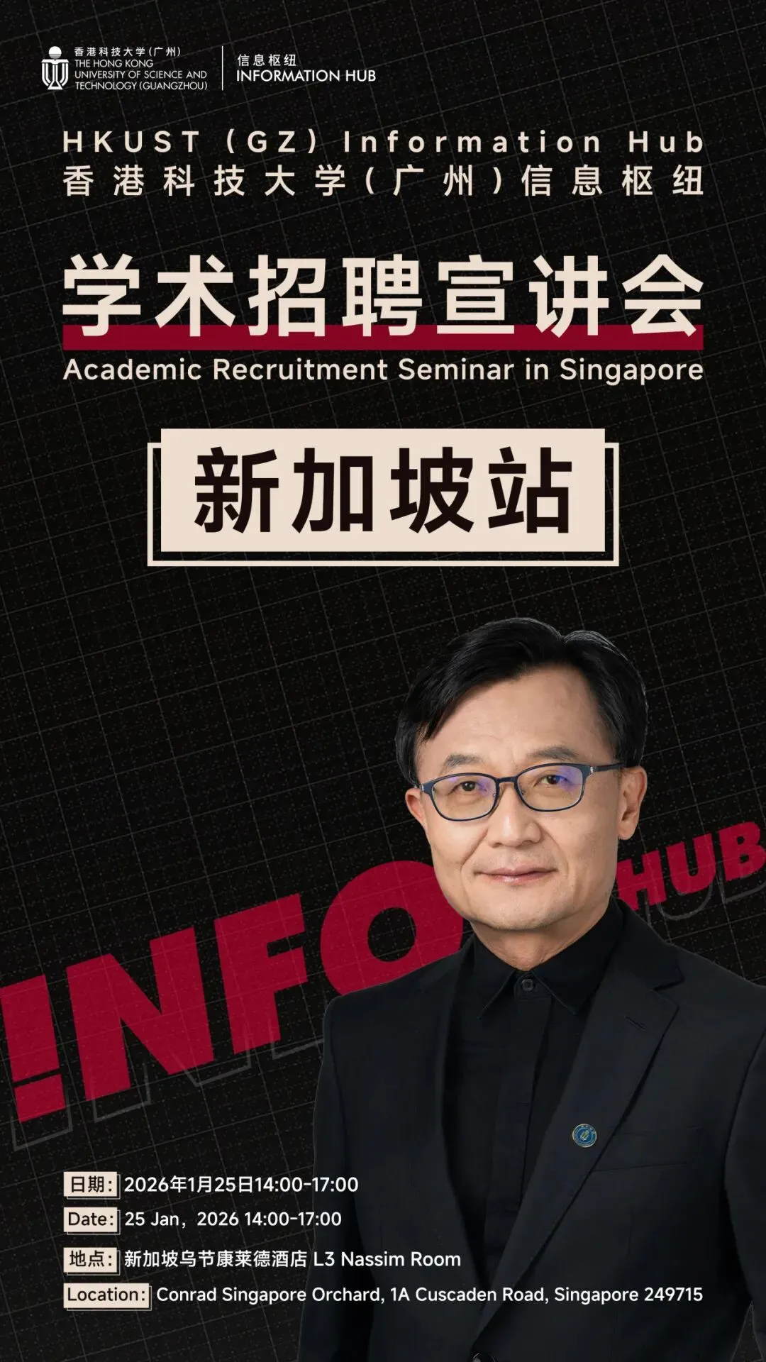 继香港站的交流之后,我们很高兴将我们信息枢纽学术招聘宣讲会带至狮城——新加坡。AAAI 2026 将于2026年1月20日至27日在新加坡博览中心举行。作为中国计算机学会(CCF)认定的A类顶级会议,AAAI 是人工智能领域最具影响力的国际学术平台之一。会议期间,我将与团队一同参与交流,并于1月25日下午2点至5点,在新加坡乌节康莱德酒店L3 Nassim Room 举办专场学术招聘宣讲会。我们诚邀所有对加入香港科技大学(广州)信息枢纽感兴趣的优秀学者、研究人员及青年人才前来交流。无论您是想深入了解我们的学术环境、研究方向,还是探讨合作与职业发展机会,我们都欢迎您前来坐一坐、聊一聊。期待与您在新加坡相见,共谋科研新篇章!