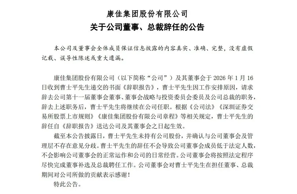 1月16日晚间,康佳集团股份有限公司发布关于公司董事、总裁辞任的公告,公司及其董事会于2026年1月16日收到曹士平递交的书面《辞职报告》,曹士平因工作安排原因,请求辞去公司第十一届董事会董事、董事会战略与投资委员会委员及公司总裁的职务。