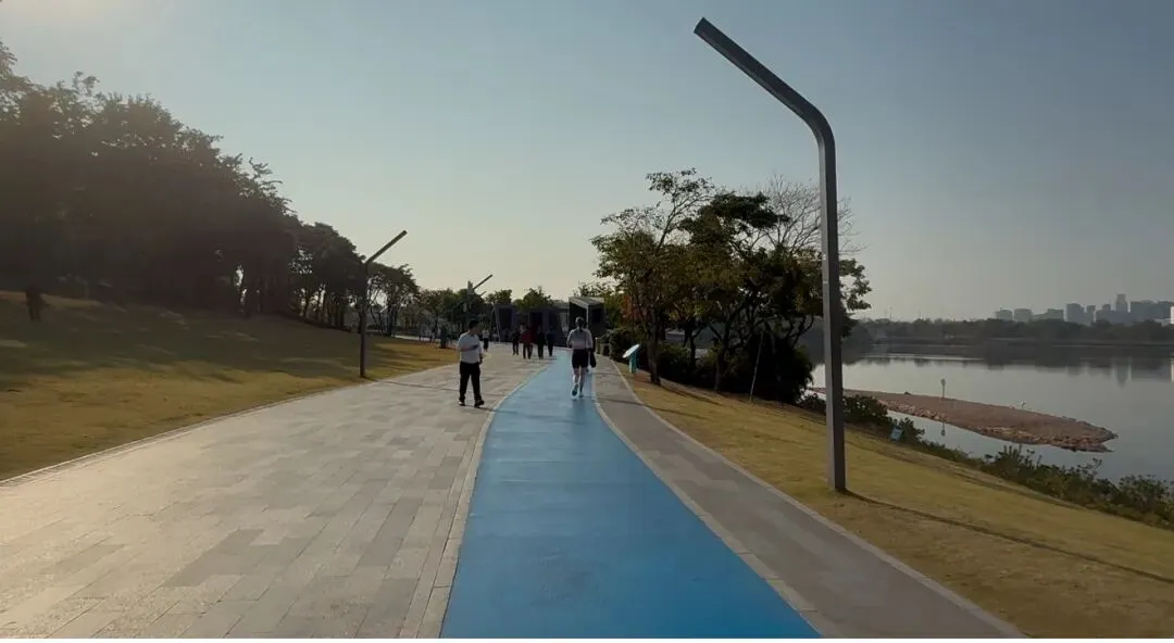 蓝色的跑道崭新平坦,环湖延伸,一圈大约2.5公里。跑步时,可以望见“春笋”那样的楼影倒映水中,偶尔还能遇见成群的候鸟从湖面低低掠过。锻炼的人们络绎不绝,步履不停。