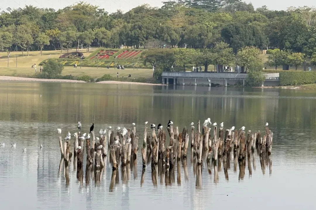 我顺着跑道慢慢走。周末的人潮里,鸟的身影似乎也密了。东侧人才桥畔的湖中木桩上,竟栖着好几十只,远远看去黑白错落,走近了,才辨出里头还有灰的。