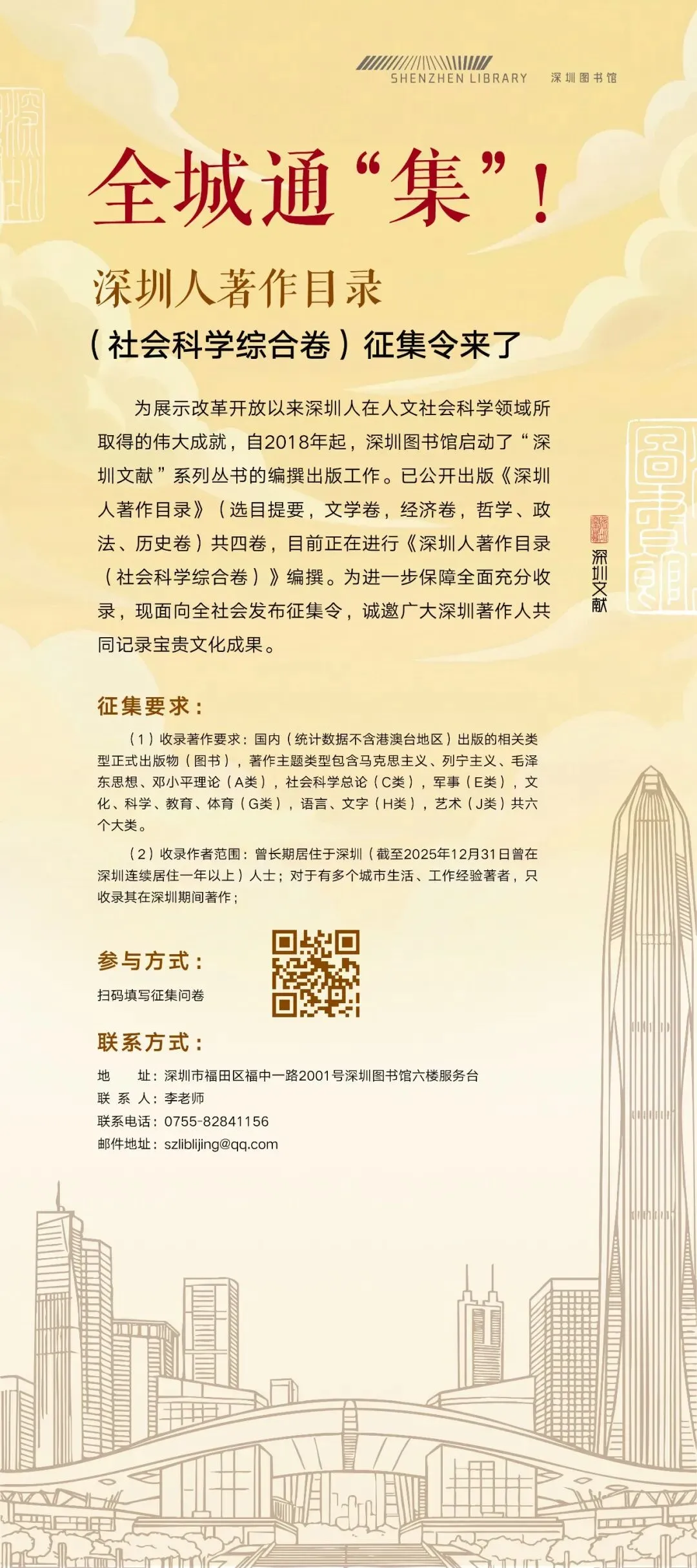 如果您截至2025年12月31日曾在深圳连续居住一年以上,且在国内(统计数据不含港澳台)正式出版过上述领域的著作,欢迎扫描下方二维码,填写个人及著作信息,让您的作品被收录于《深圳文献·深圳人著作目录》;若你愿意捐赠著作原件,我们将妥善珍藏于深圳文献库,让书香永续流传。