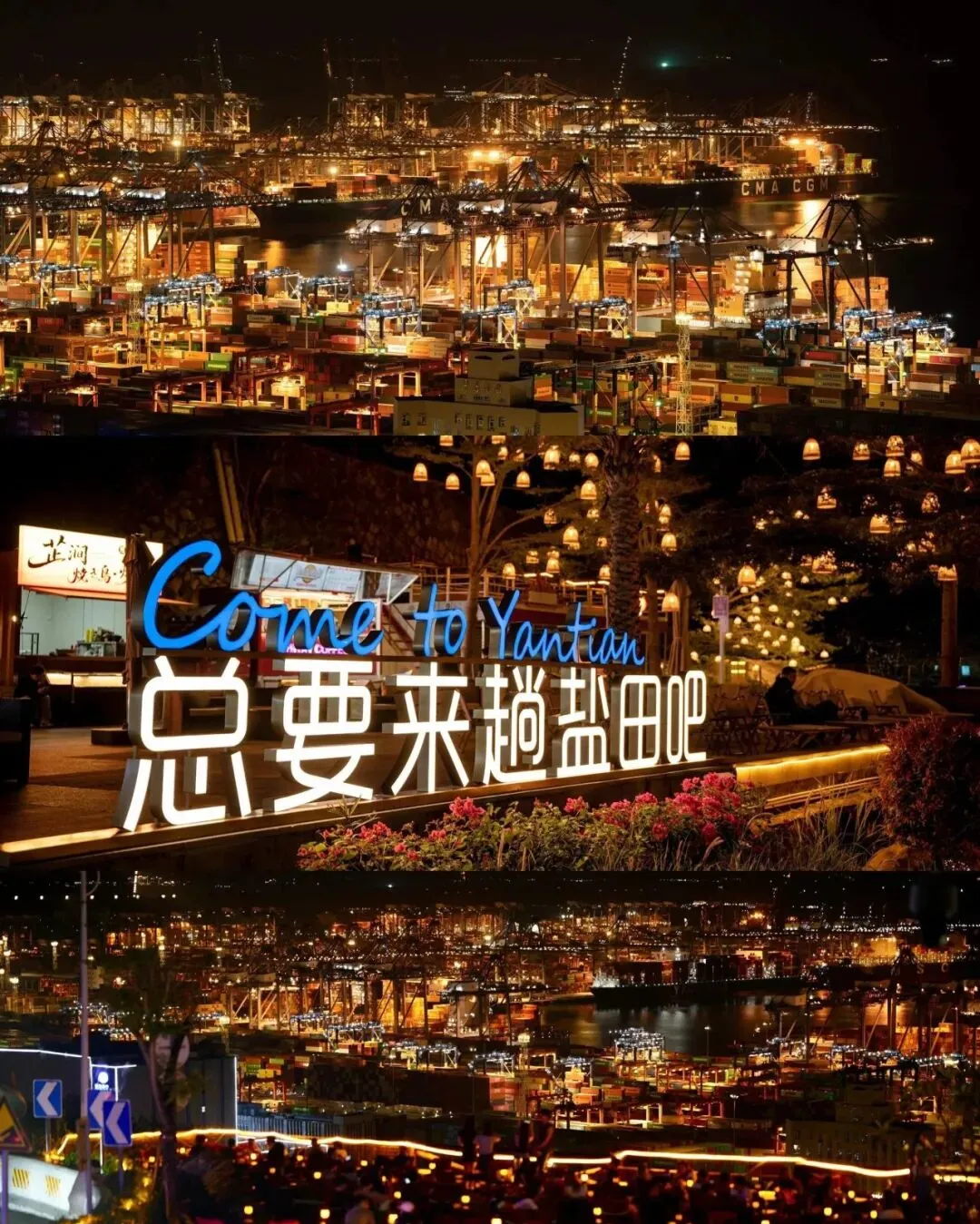 白天站在观景台,能俯瞰盐田港的碧海蓝天,夜幕降临后,港口灯火与夜市霓虹交相辉映,晚风微凉,吹走一天疲惫,随手一拍都是电影感大片。