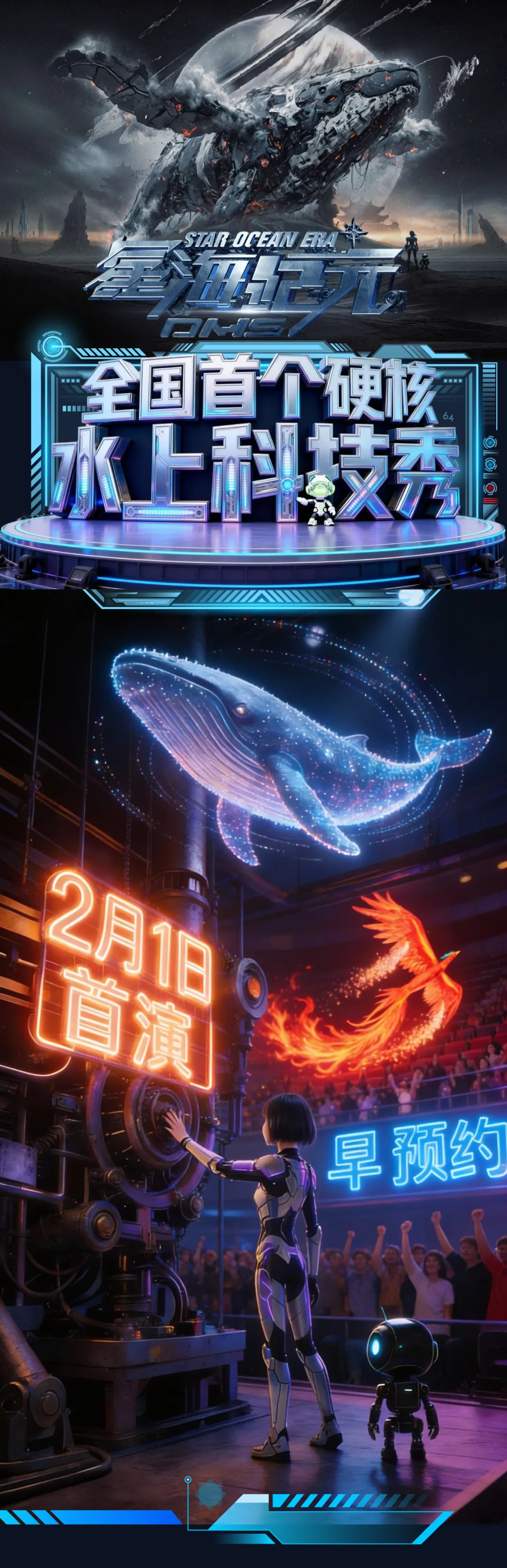 当海浪遇见全息光影,当古老传说碰撞未来科技深圳大梅沙,这座总是给人惊喜的海滨明珠,一场以"科幻+国风"为笔,以海洋生态为纸的科技演艺大秀<<星海纪元DMS>>,将星空与大海连接成跨越时空的叙事舞台。赛博朋克+国风美学+AI搭档,将把海面卷成可移动巨幕,这是一场视觉盛宴,更是一场关于AI共生,海洋守护与城市灵魂的深度对话。-------------------------