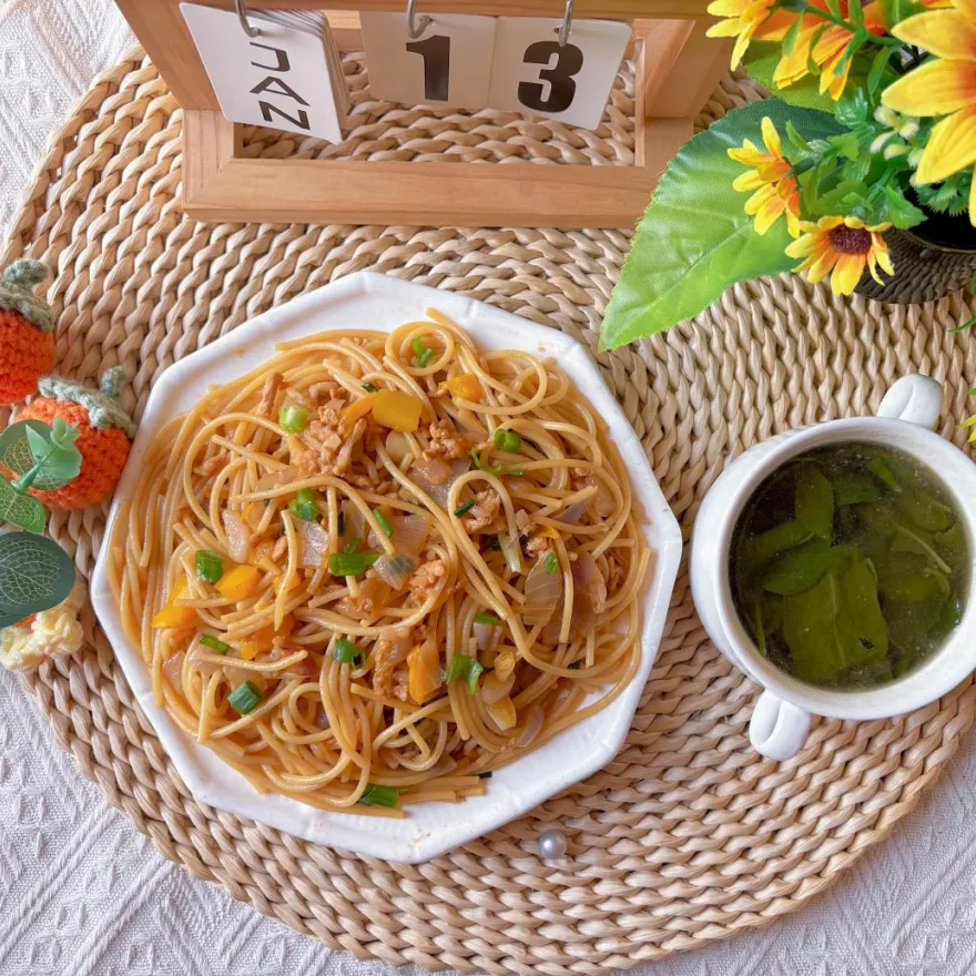 早餐:肉酱捞意粉、枸杞叶瘦肉汤