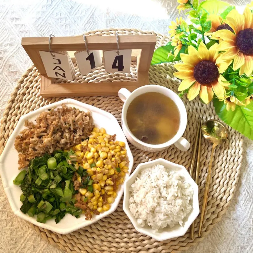玉米粒炒肉、清炒菜心